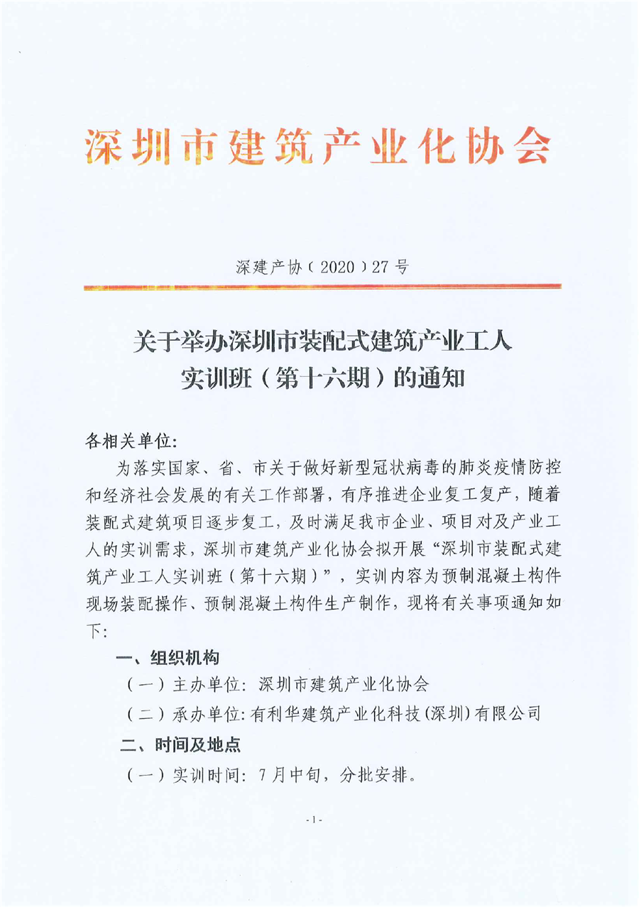 关于举办深圳市装配式建筑产业工人实训班(第十六期)的通知