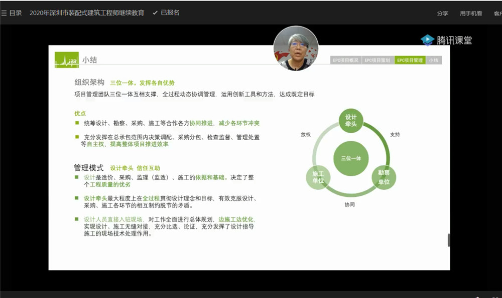 刘总以国际低碳城产业园区配套住房为例,分享了以设计企业牵头的EPC工程总承包项目探索与实践。该项目是设计牵头EPC总承包的政府投资人才配套住房项目,在龙岗区乃至深圳市范围内尚属首例。她重点介绍了项目策划情况,及从项目前期、报批报建、设计管理、招标采购、施工配合、文件管理等方面介绍了项目管理情况。刘总认为,设计牵头可以在最大程度上在全过程贯彻设计理念和目标,有效克服设计、采购、施工各环节的相互制约脱节的矛盾。