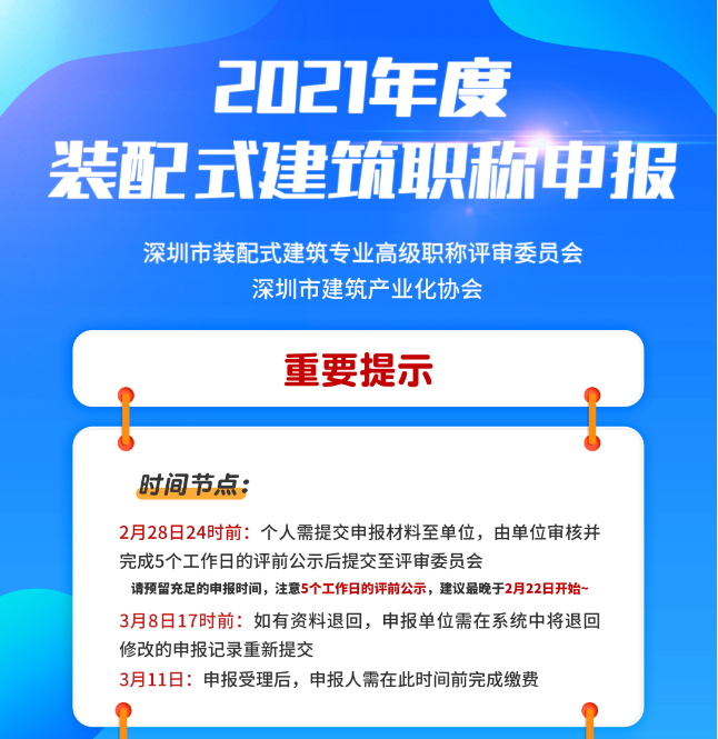 2月14日,深圳市装配式建筑专业高级职称评审委员会在线上举办了2021年度建筑工程(装配式建筑)职称评审二次宣贯会议。本次会议除了对装配式建筑职称评审的重要性、申报政策、流程操作、测评须知、资料申报等常见问题进行了细致的讲解外,还特别强调了本次职称申报的重要时间节点、继续教育和政策的重大变化等注意事项,吸引了近1000名申报人员观看。