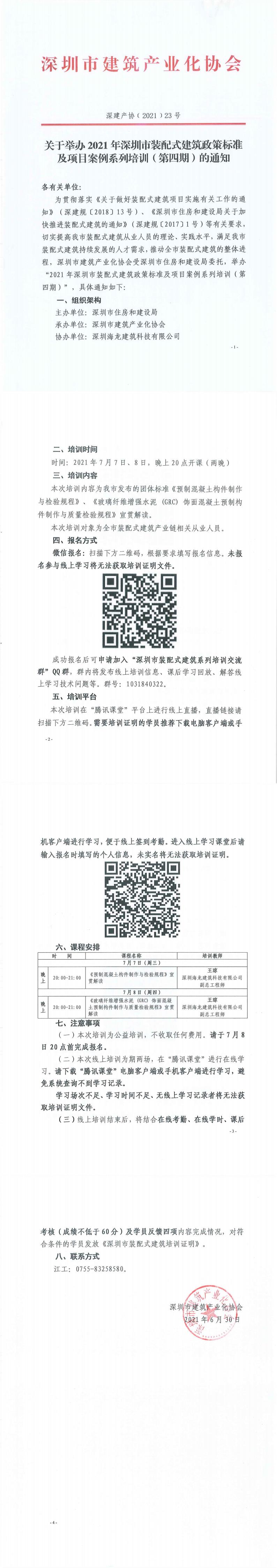 关于举办2021年深圳市装配式建筑政策标准及项目案例系列培训(第四期)的通知