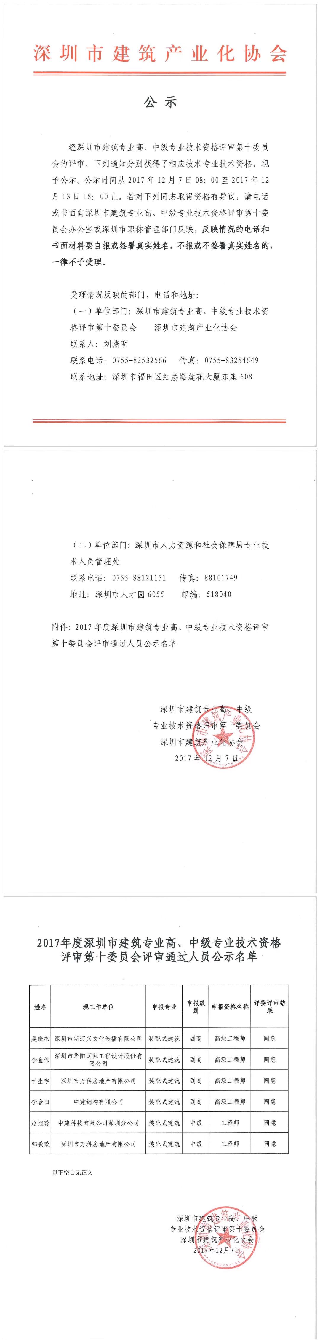 2017年深圳市建筑专业高、中级专业技术资格评审第十委员会装配式建筑高、中级工程师评审通过人员名单公示