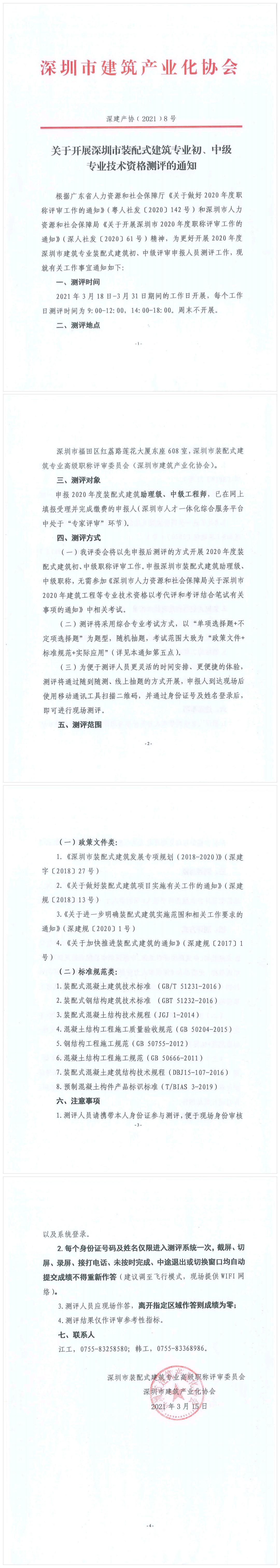 关于开展深圳市装配式建筑专业初、中级 专业技术资格测评的通知