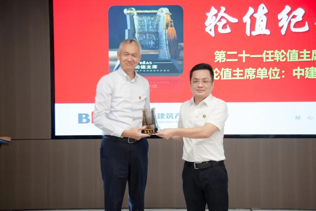 上任轮值主席杨广海针对过去一段时间里的任期履职情况进行了小结。他表示议题的相关工作在稳步推进中,虽然轮值时间已经到期,但对议题的推进并不会停止,他还从深入推进工业化建造的标准化、开发应用工程建设信息化技术、研发与推动低碳建造新模式与新技术等方面表达了对协会引领行业未来发展的展望。最后,他表示,接下来将紧扣议题相关任务,借助协会的平台力量持续推进,努力促进共享共赢、共同维护良好行业生态、共推行业蓬勃发展。