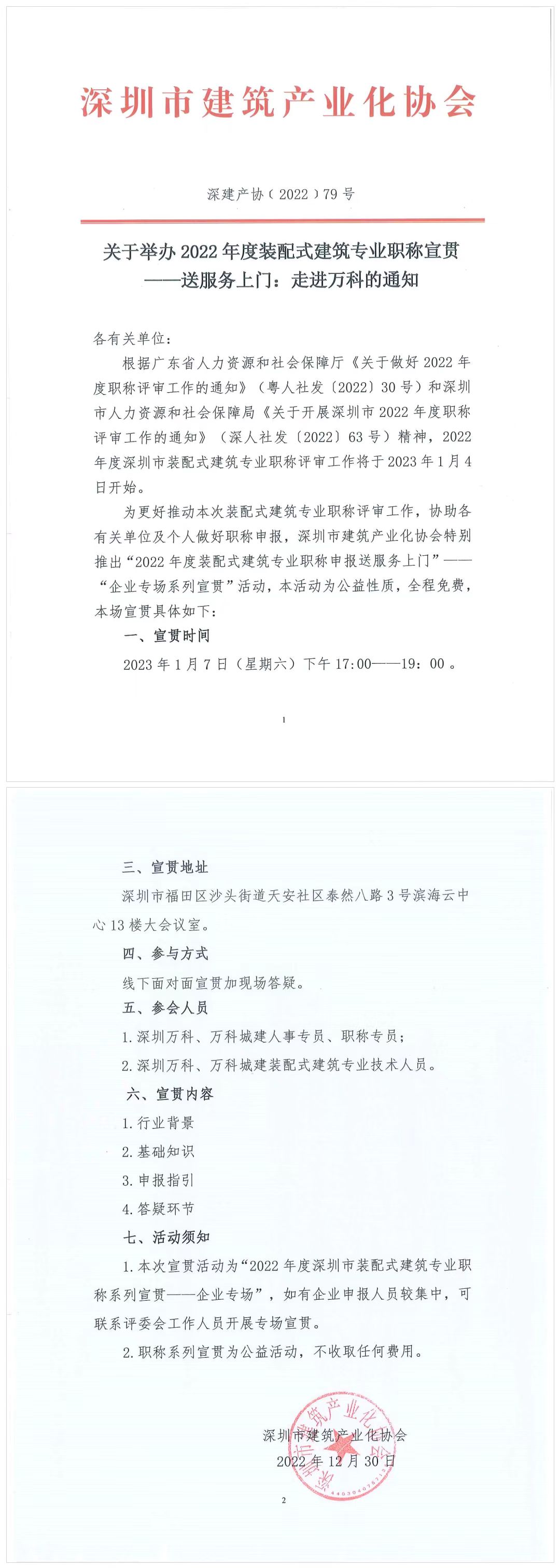 关于举办2022年度装配式建筑专业职称宣贯一送服务上门:走进万科的通知