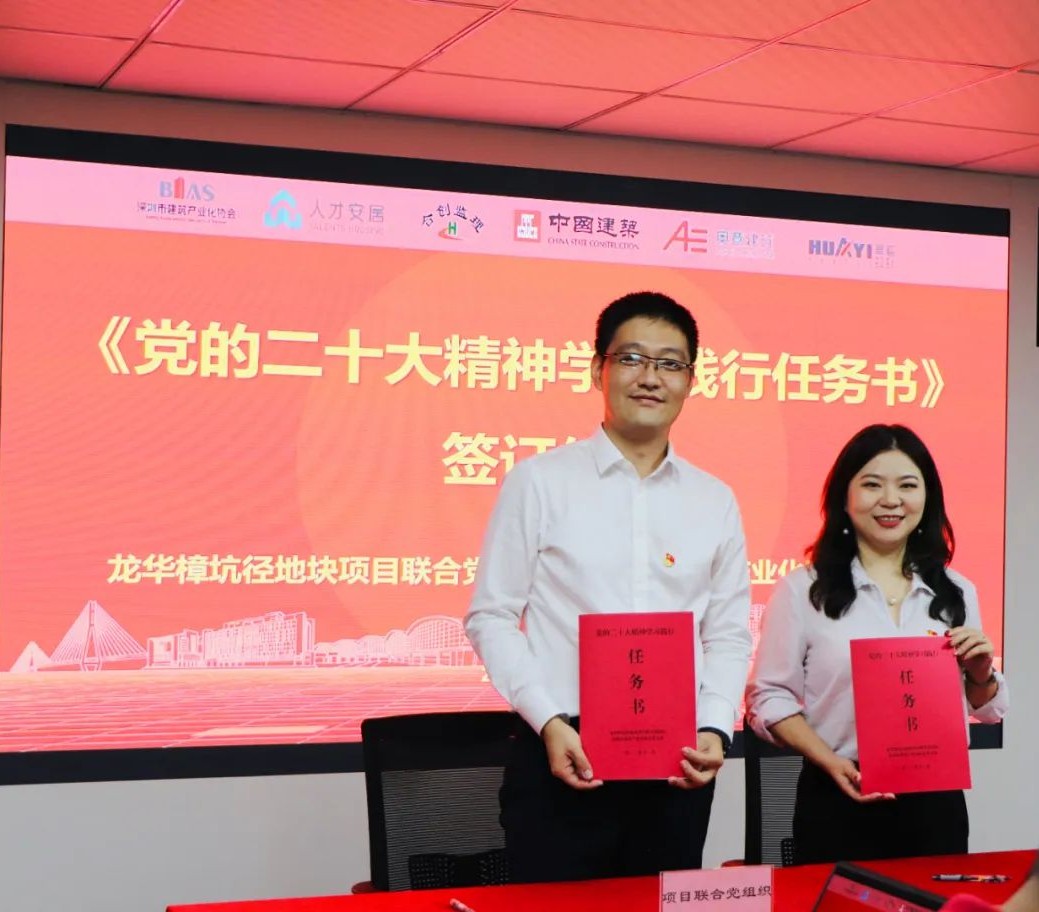 为进一步发挥党建引领,深圳市建筑产业化协会党支部书记、秘书长付灿华与项目联合党组织代表、龙华人才安居公司工程管理部部长、项目经理张磊共同签订《党的二十大精神学习践行任务书》,将为进一步强化二十大精神学习、全面深化党建共建、技术交流,合力推动装配式建筑在龙华樟坑径地块项目创示范、立标杆,提升行业影响力提供坚实保障。