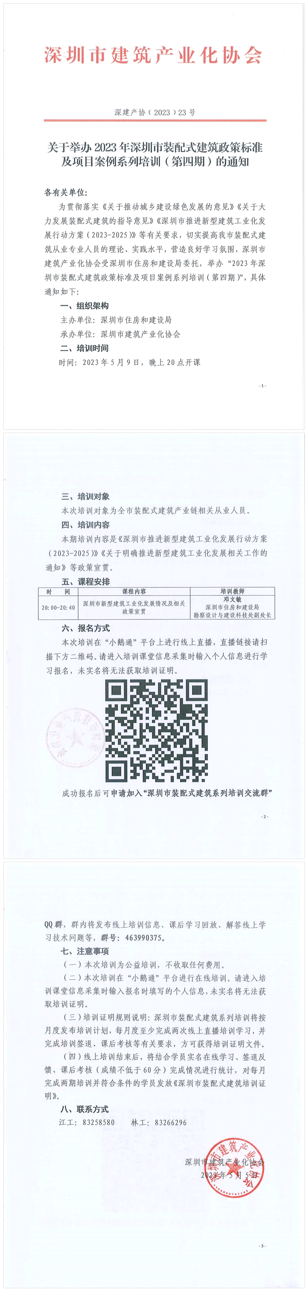 关于举办2023年深圳市装配式建筑政策标准及项目案例系列培训(第四期)的通知