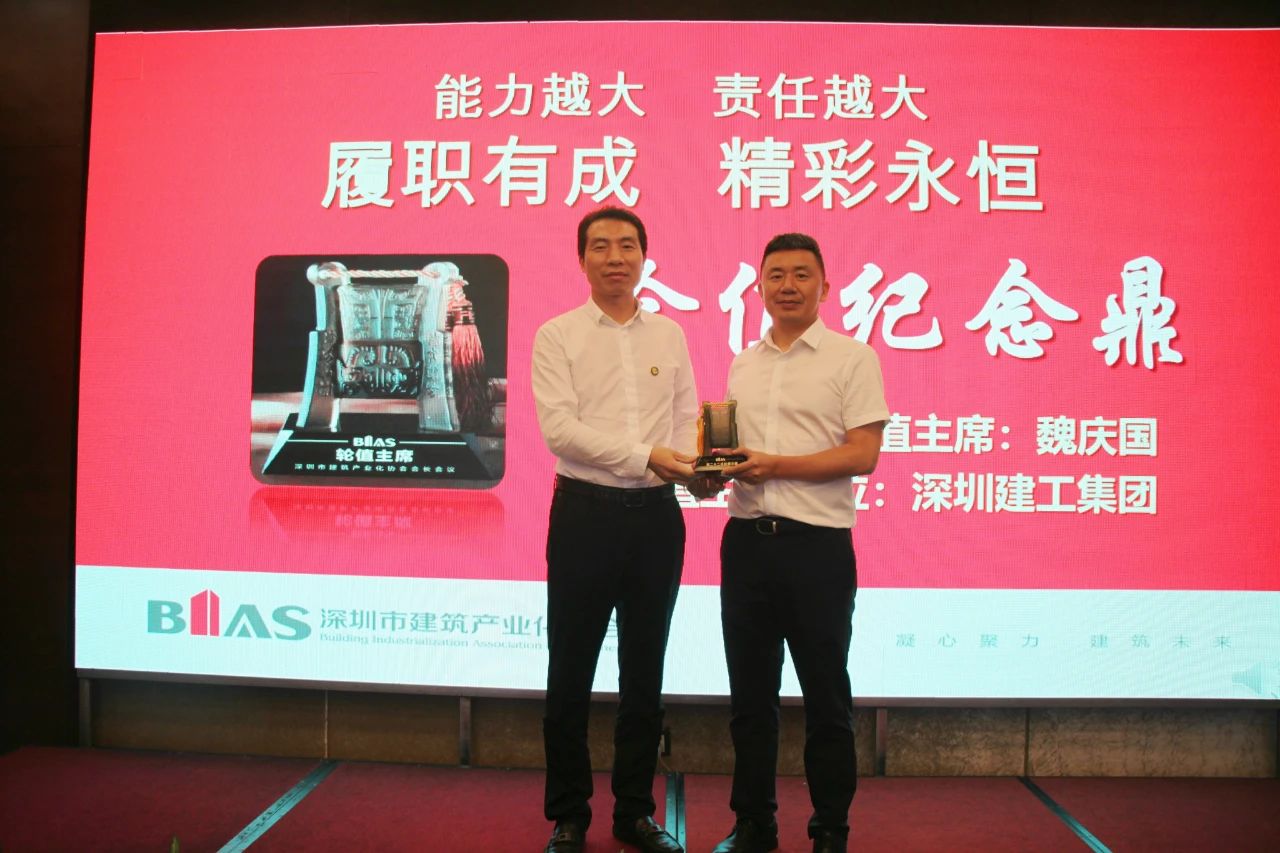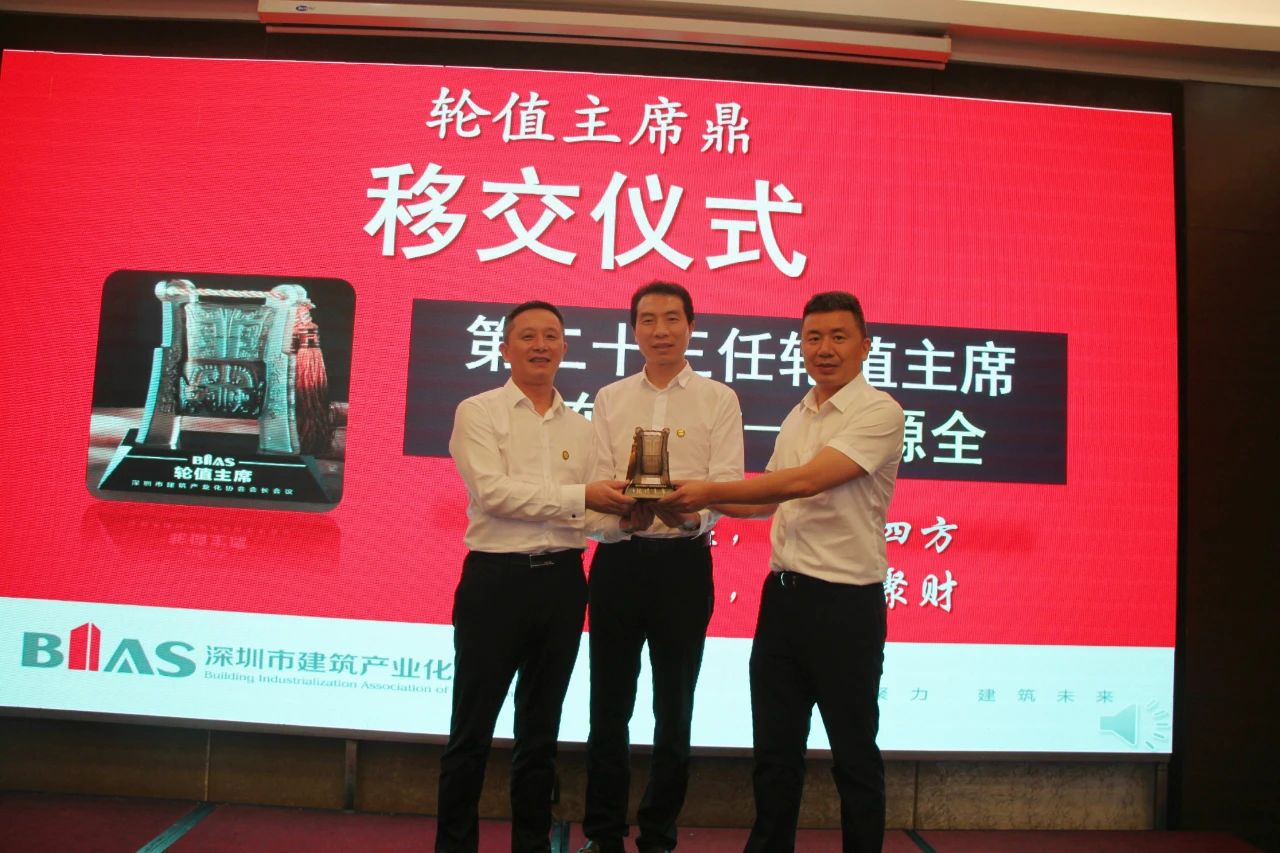 在轮值主席鼎移交仪式中,现任轮值主席汪嫄全从龙玉峰会长手中接过“轮值主席鼎”。深圳建工集团副总裁李世钟代表上任轮值主席魏庆国从龙玉峰会长手中接过“轮值纪念鼎”。