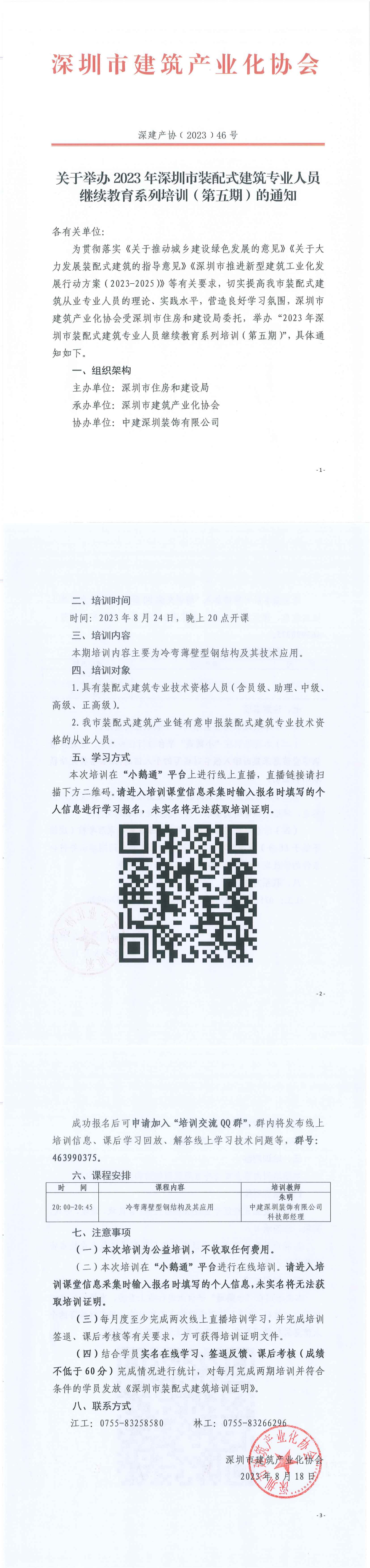 关于举办2023年深圳市装配式建筑专业人员继续教育系列培训(第五期)的通知