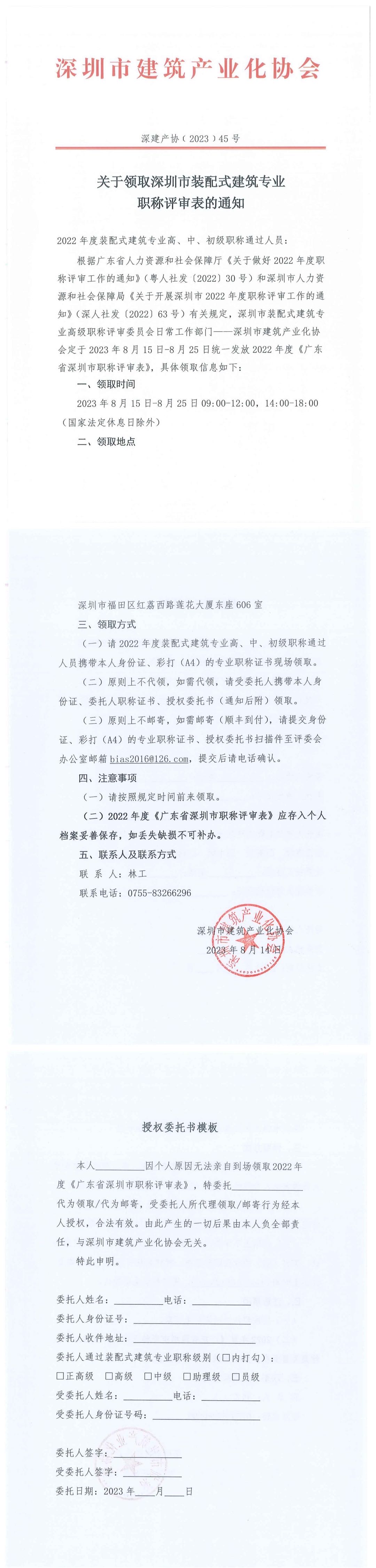 关于领取深圳市装配式建筑专业职称评审表的通知
