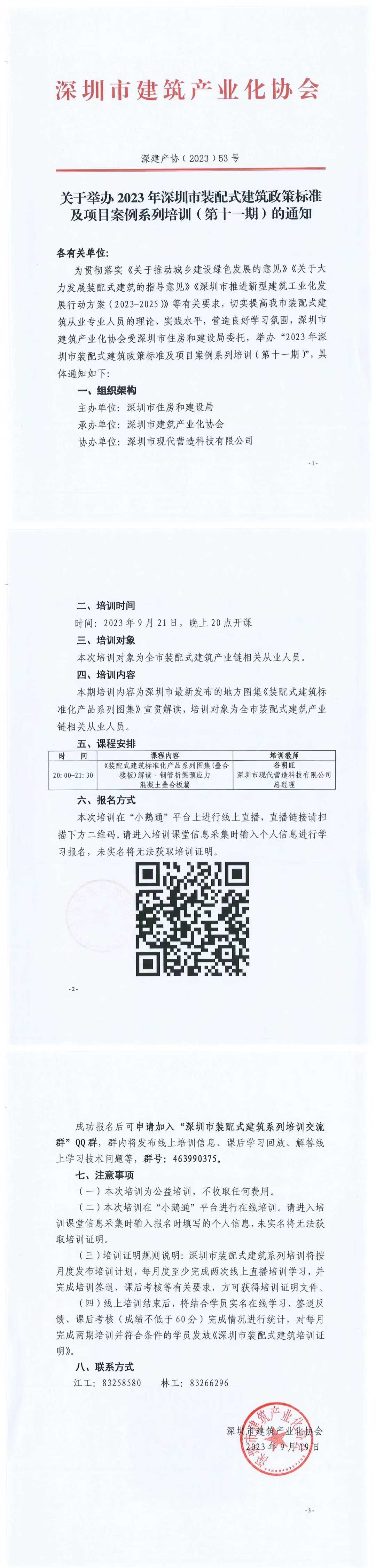 关于举办2023年深圳市装配式建筑政策标准及项目案例系列培训(第十一期)的通知