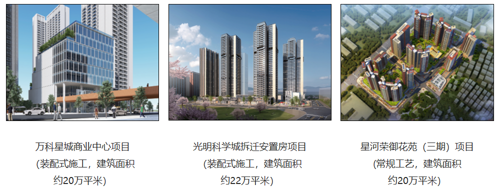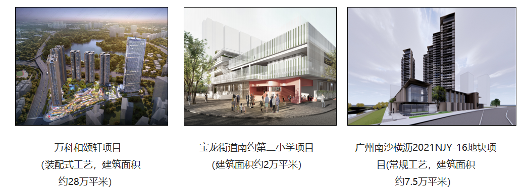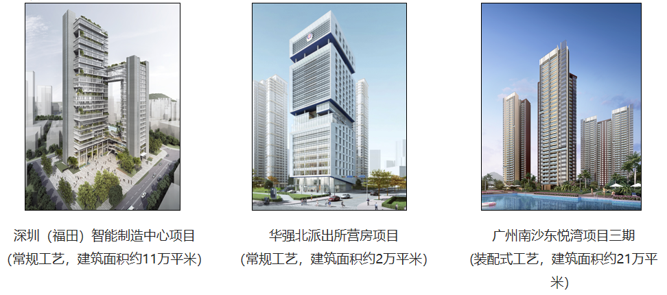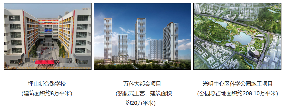 房建业绩主要有:深圳市回龙埔片区城市更新单元二期北区项目、深圳市龙华新区民治办事处梅林关城市更新项目、深圳市龙华区民治办事处梅林关城市更新项目装修工程、广州南沙东悦湾旧改项目、广州南沙横沥项目、星河明珠湾花园、万科大都会家园、光明科学城项目、万科沙井星城名邸项目、万科蛇口公馆、广州南沙星河片区超150万平米超大型综合性项目,及南约第二小学、麒麟中学、深圳湾中学、学府小学、新合路学校等政府代建项目,完成总建筑面积超500万平米。
