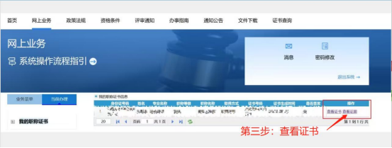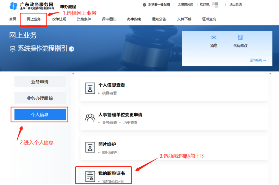 二、选择“网上业务”→“个人信息”→“我的职称证书”