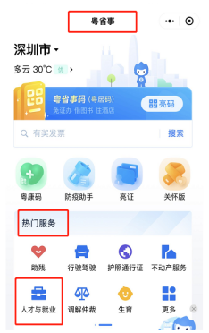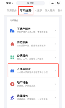一、打开微信粤省事小程序进入专项服务→人才与就业。