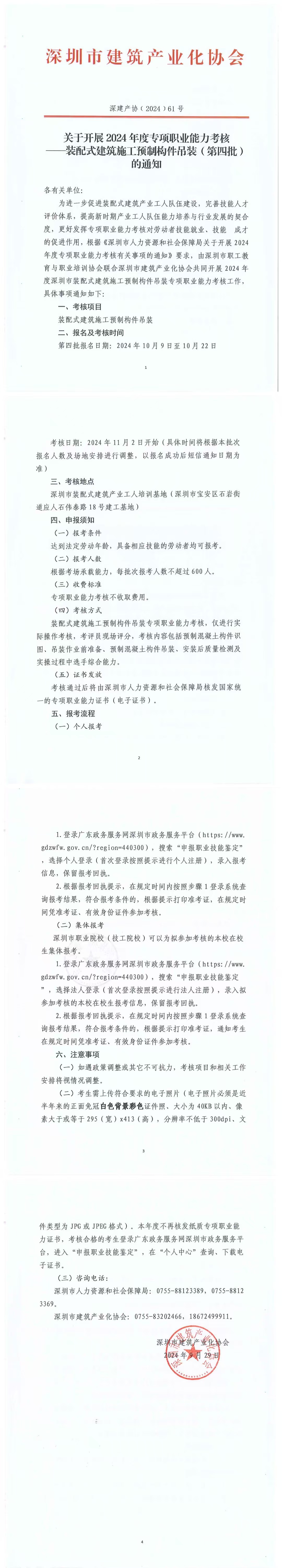 关于开展2024年度专项职业能力考核 ——装配式建筑施工预制构件吊装(第四批)的通知